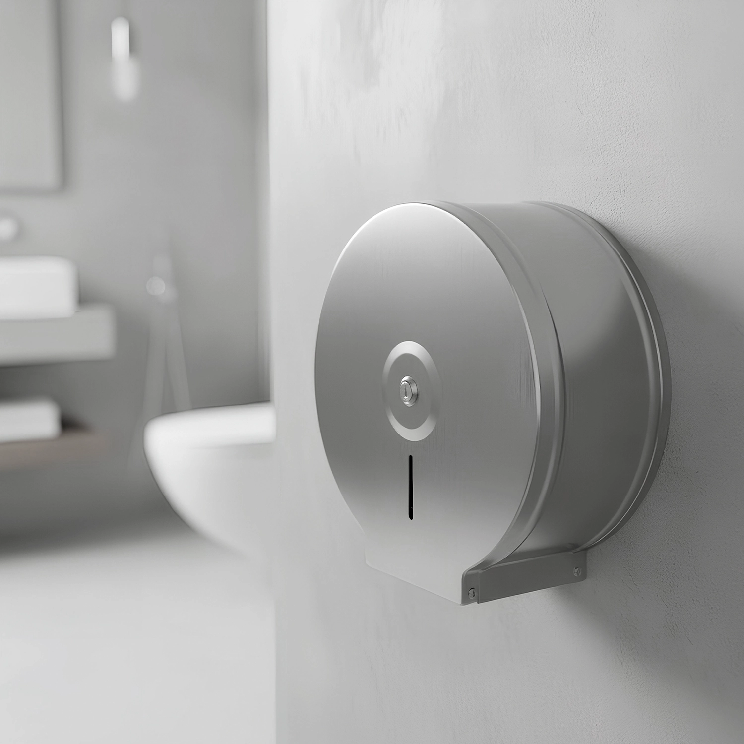 - Dispensador para papel higiénico en rollo jumbo fabricado en acero inoxidable de excelente calidad, con un diseño moderno pensado para el área institucional, que aporta higiene y practicidad en baños y servicios higiénicos.
